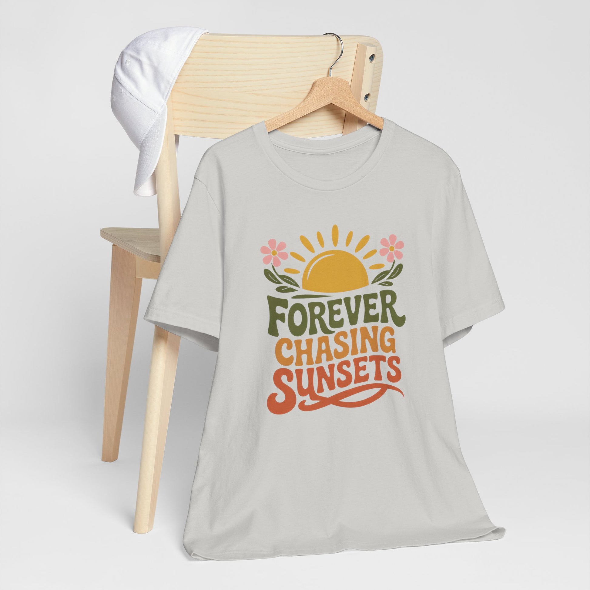 Soft, sun-soaked vibes stitched into a lightweight tee. This breathable 100% Airlume combed and ring-spun cotton shirt carries a warm retro graphic—golden sun, leafy accents, and hand-lettered text that reads “Forever Chasing Sunsets.” The fit is relaxed but neat, with a crew neckline and side seams that keep the shape through washes. Wear it on casual evening walks to the beach, on weekend road trips, or layered under a jacket for bonfire nights. The tear-away label keeps the back of your neck comfortable.