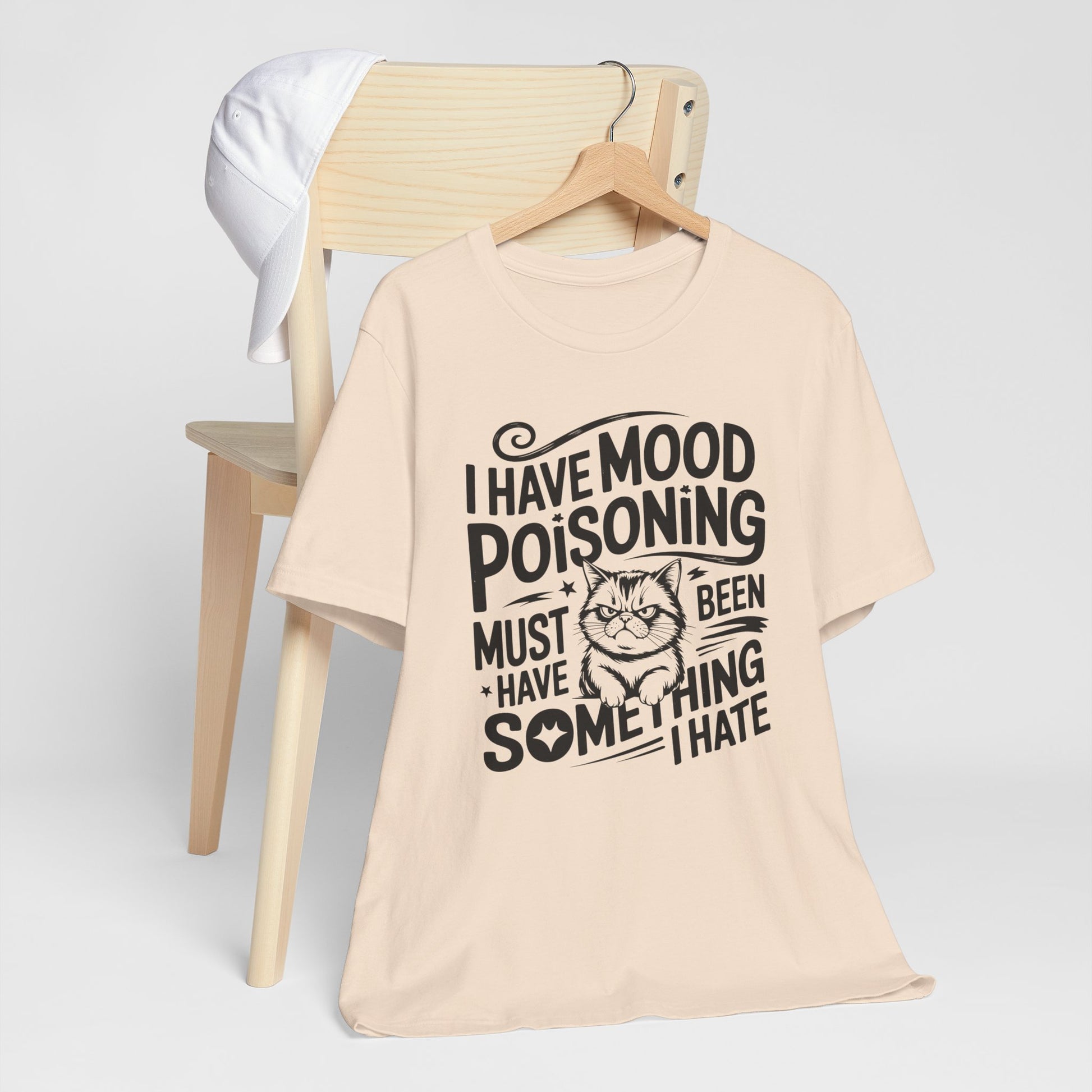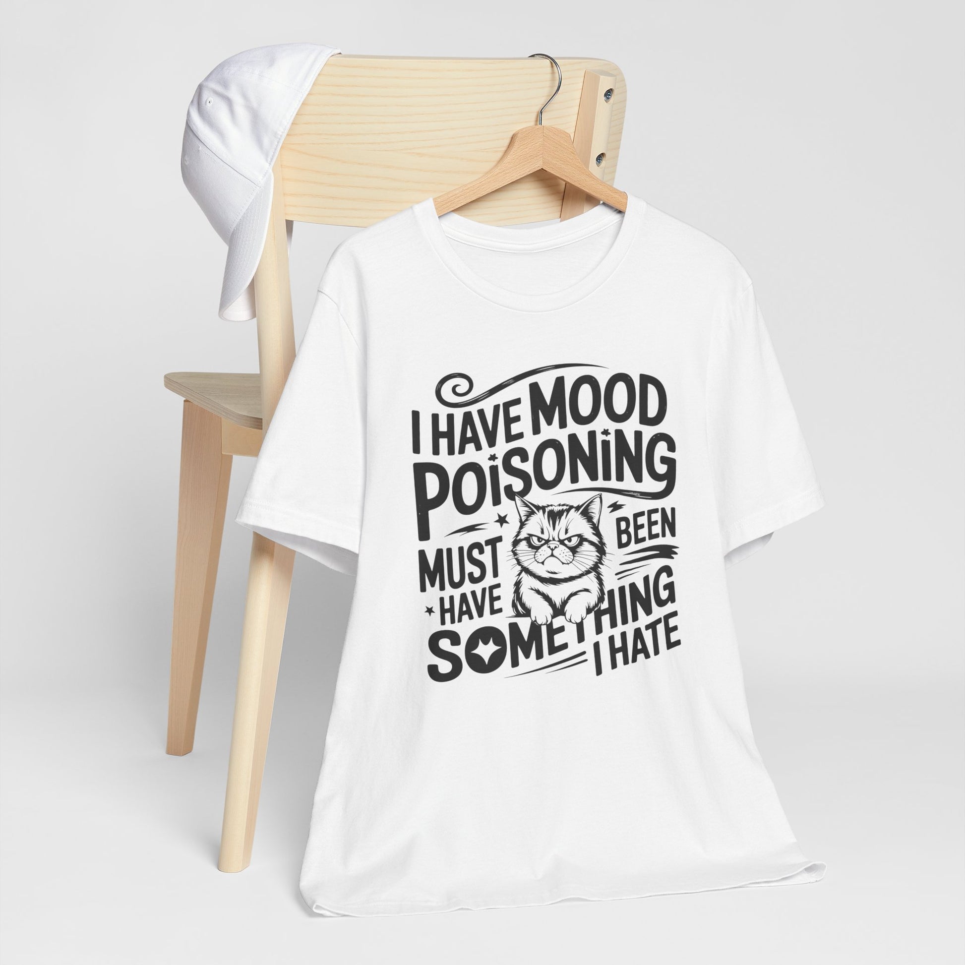 A soft, breathable jersey tee that delivers attitude and comfort in equal measure. The centered black graphic—an indignant cartoon cat and bold hand-lettering reading “I have mood poisoning, must have been something I hate”—lands with playful sarcasm.
