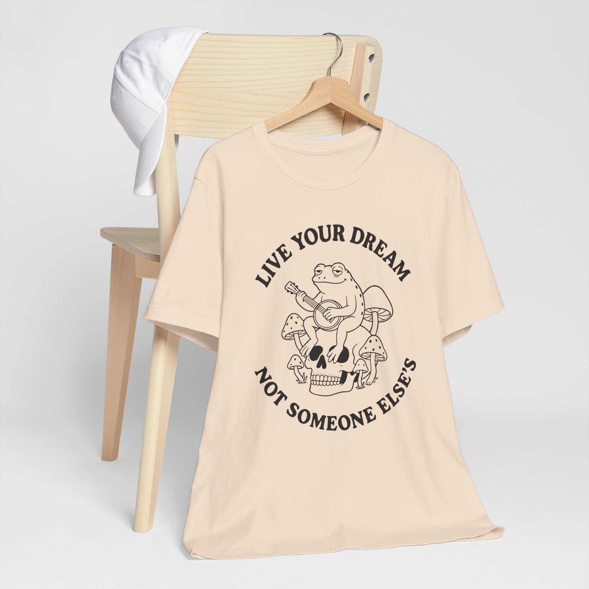 This lightweight jersey tee carries a quiet, rebellious mood — a small frog strums a guitar atop a skull surrounded by mushrooms, framed by the words “Live your dream, not someone else’s.” It sits comfortably in everyday life: layered under a jacket for market days, worn solo on warm evenings, or paired with worn denim for roadside shows.
