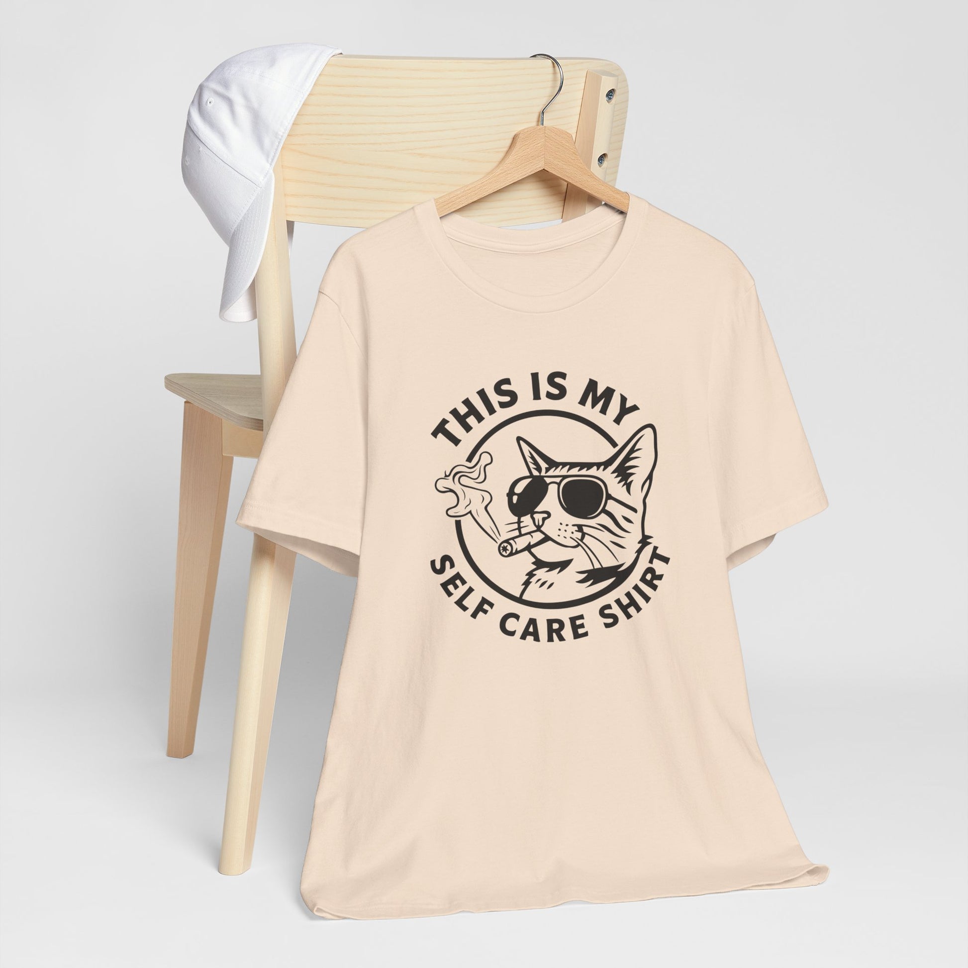 Light, honest, and a little cheeky — this tee slides into the wardrobe of someone who values downtime and a wink. The soft Bella+Canvas cotton feels breathable and easy to layer. A laid-back cat graphic wearing shades and enjoying a smoke sits front and center with the line “This is my self care shirt,” signaling relaxed priorities and dry humor.